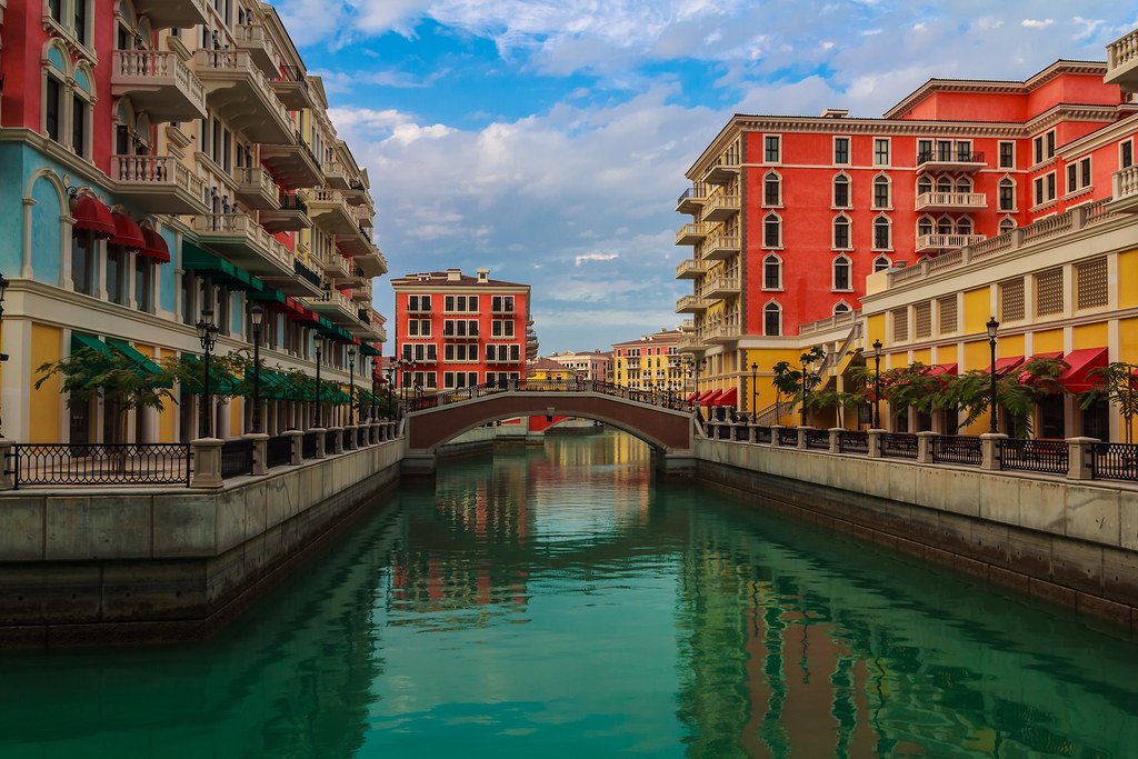 From there, head to Qanat Quartier, where pastel-colored buildings and serene canals give the area a distinctly Venetian charm. Cross the Rialto Bridge replica, discover the playful piano steps, or glide along the waterways in a water taxi.