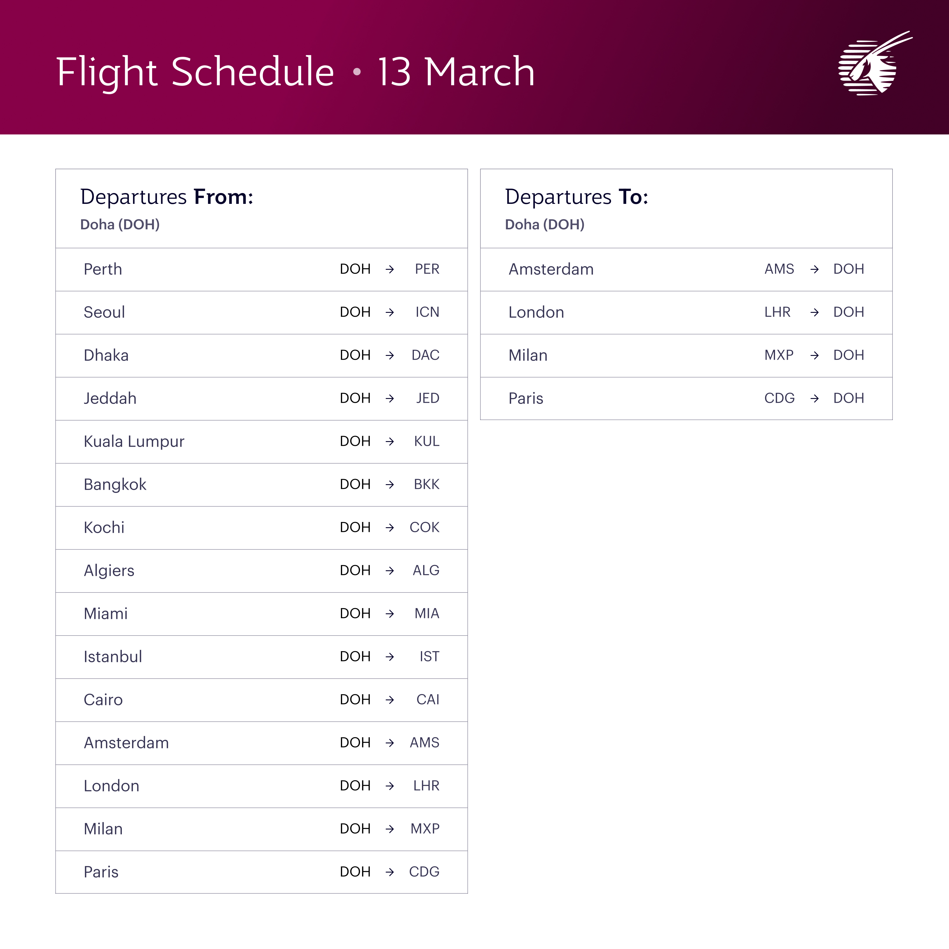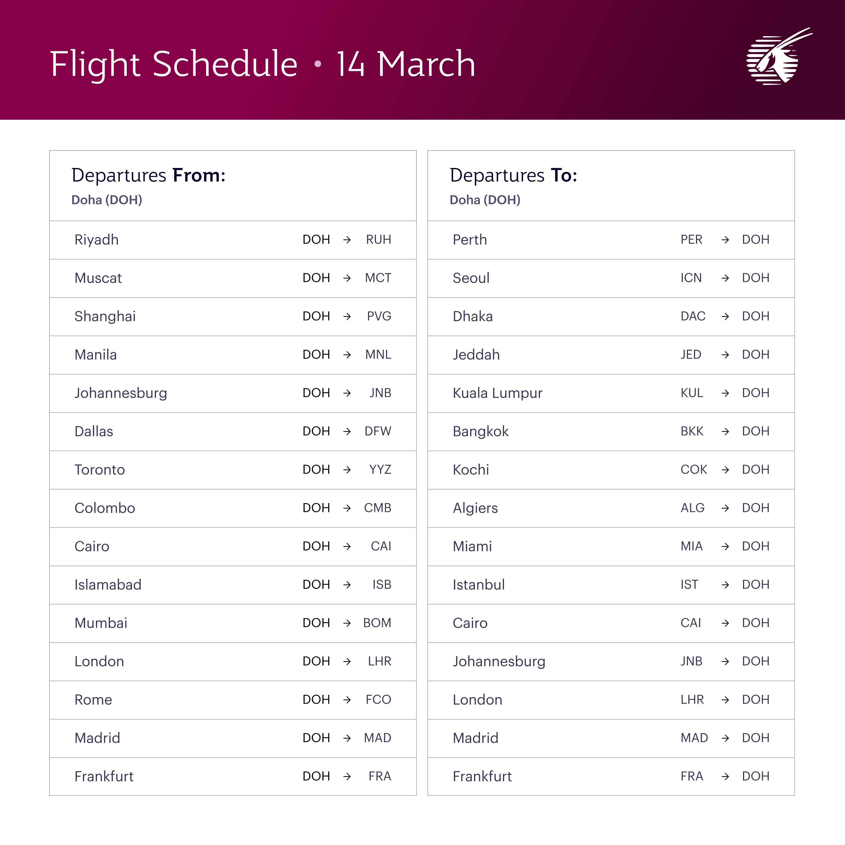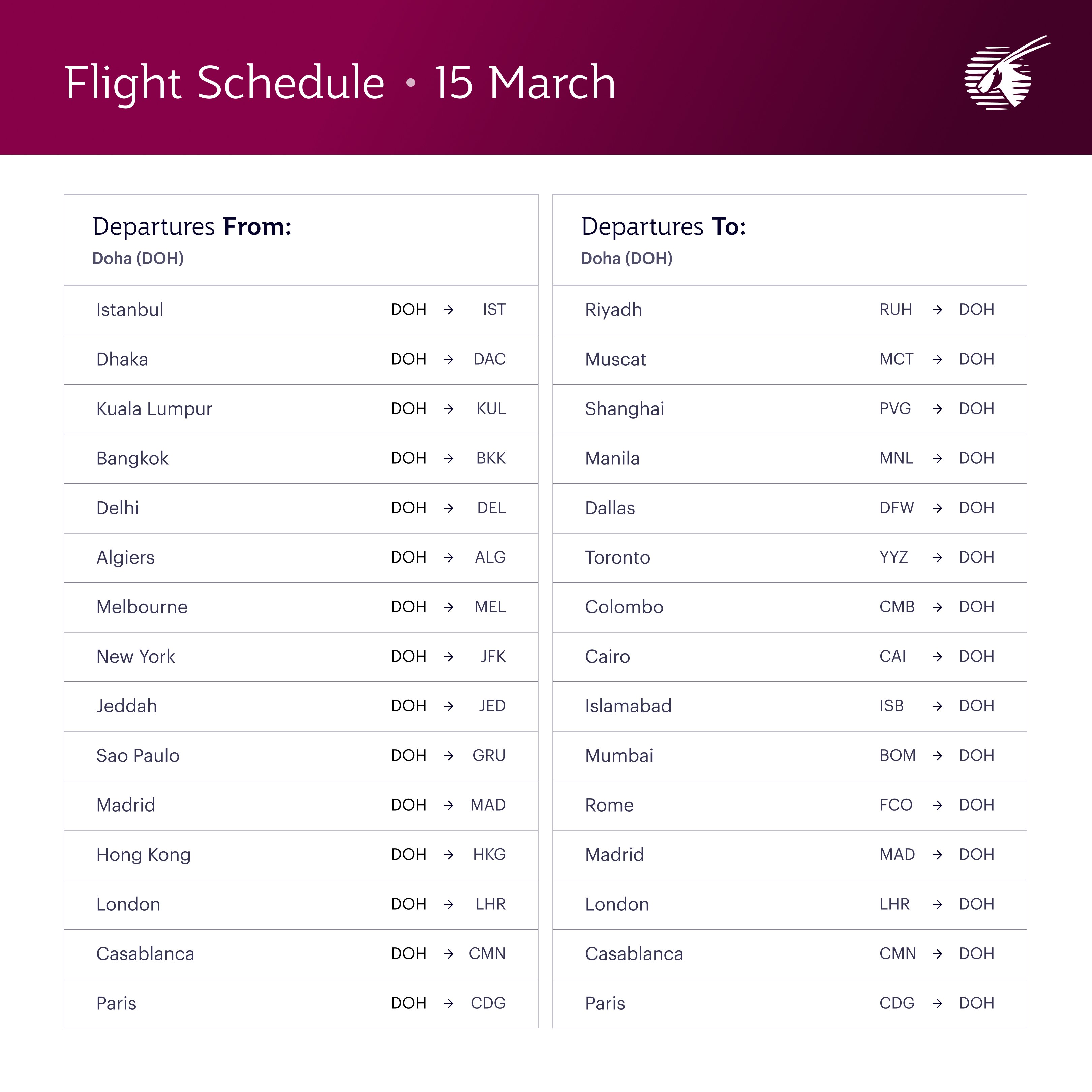 Qatar Airways Releases Updated Flight Schedule for March 13–17