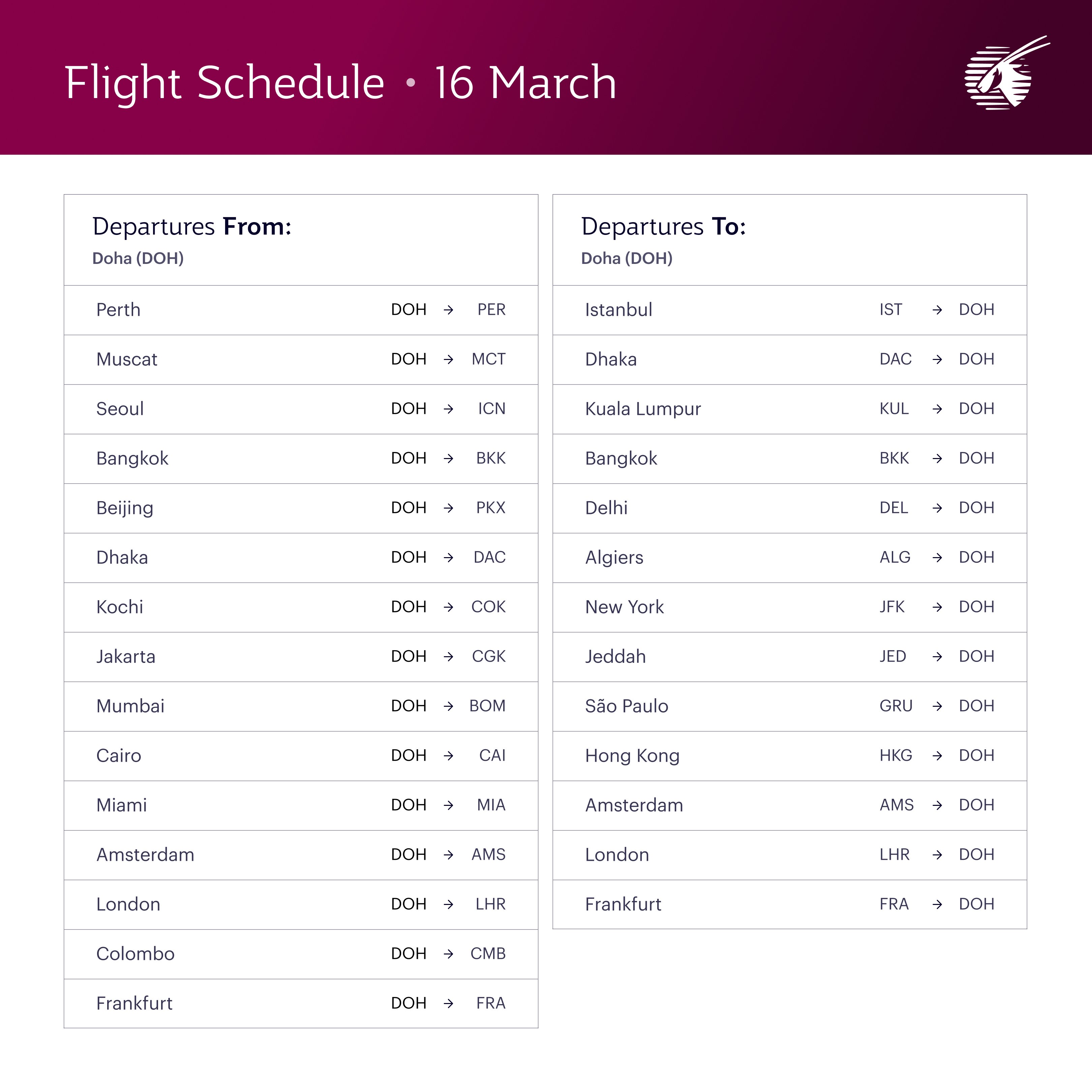 Under interim arrangements, Qatar Airways will operate a revised and limited number of flights between 18 March and 28 March 2026. The airline said the updated schedule has been expanded to provide greater flexibility for passengers seeking to travel during the disruption.